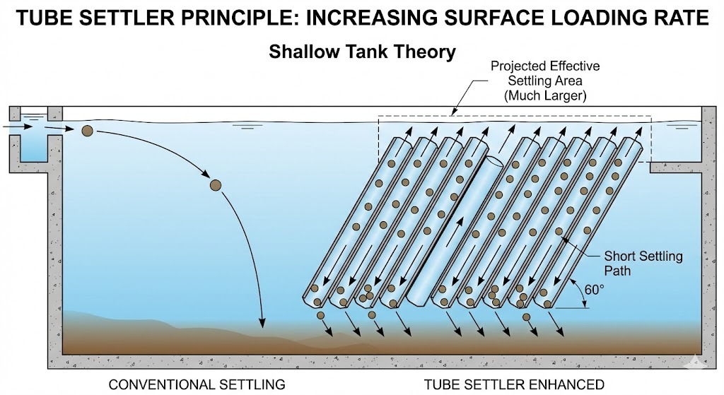 A 60-graders lutning är optimalt för sedimentering eftersom det är tillräckligt brant för att sedimenterade fasta ämnen ska glida nedför rörväggarna via gravitation (självrengörande) samtidigt som det förblir tillräckligt grunt för att maximera den effektiva horisontella sedimenteringsytan.