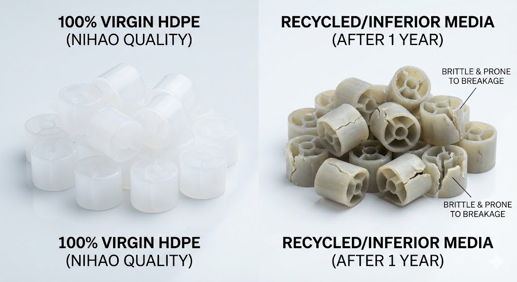 100 % Virgin HDPE (Högdensitetspolyeten) är att föredra eftersom det erbjuder överlägsen mekanisk styrka, kemisk beständighet och rätt densitet (0,95-0,97 g/cm3) för fluidisering. Återvunnet material innehåller ofta föroreningar som gör mediet sprött eller får det att sjunka, vilket leder till systemfel inom 2-3 år.